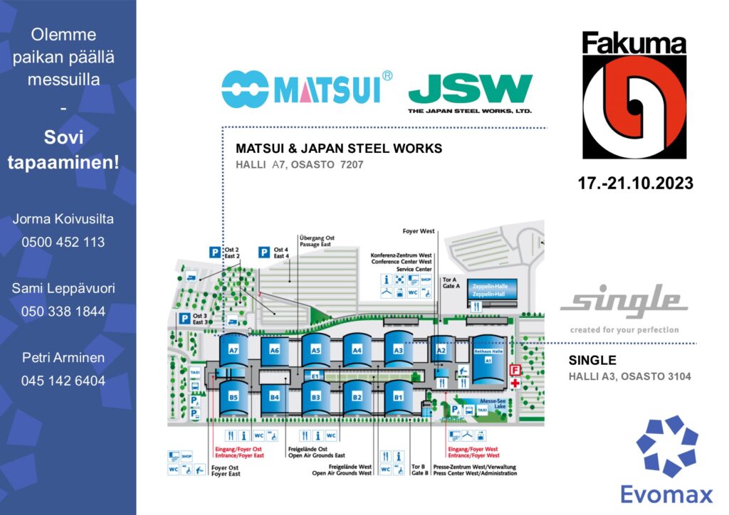 JSW on japanilainen täyssähköisten ruiskuvalukoneiden valmistaja. Ruiskuvalukoneet ovat innovatiivisia, turvallisia ja helppokäyttöisiä. Myös energiansäästö ja ympäristöystävällisyys on huomioitu valmistuksessa. JSW-ruiskuvalukoneet ovat asiakaskohtaisesti räätälöitävissä. Koneisiin on saatavilla myös lisäruiskutusyksiköitä.